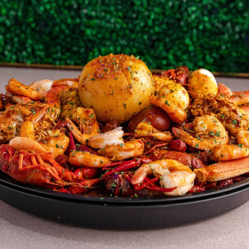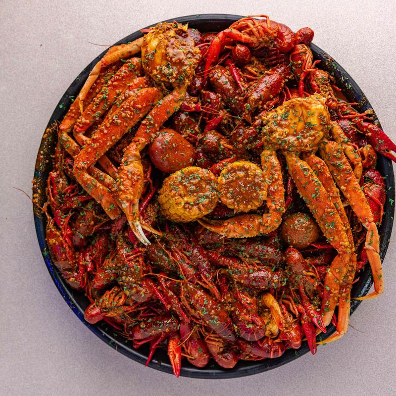 5 lb. crawfish, 10 pieces shrimp, 2 pieces corn, 2 pieces potato, and 2 sauces.