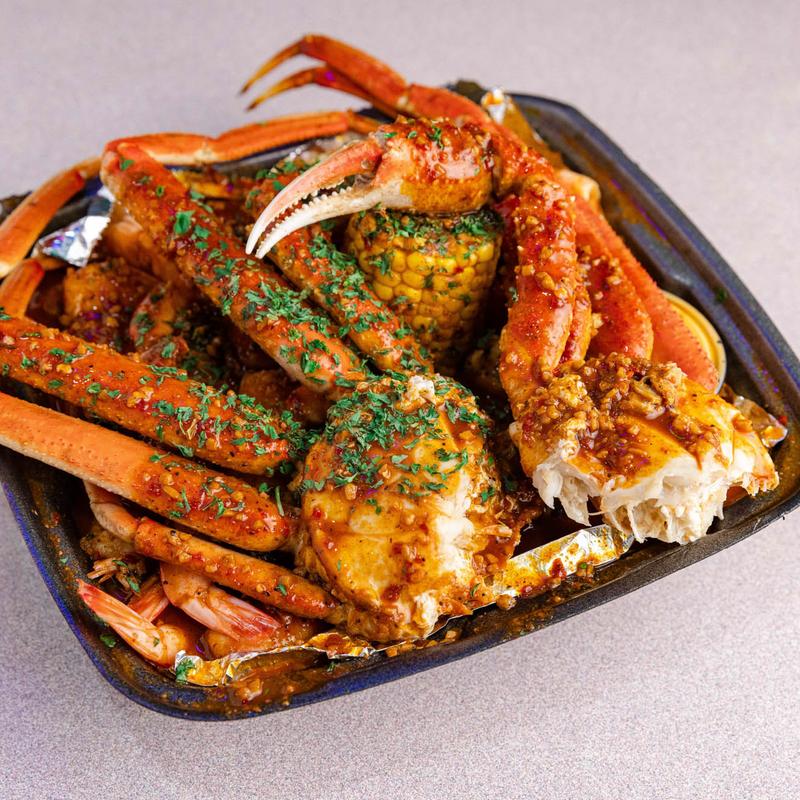 5 lb. crawfish, 2 pieces snow crab, 2 pieces corn, and 2 pieces potato.